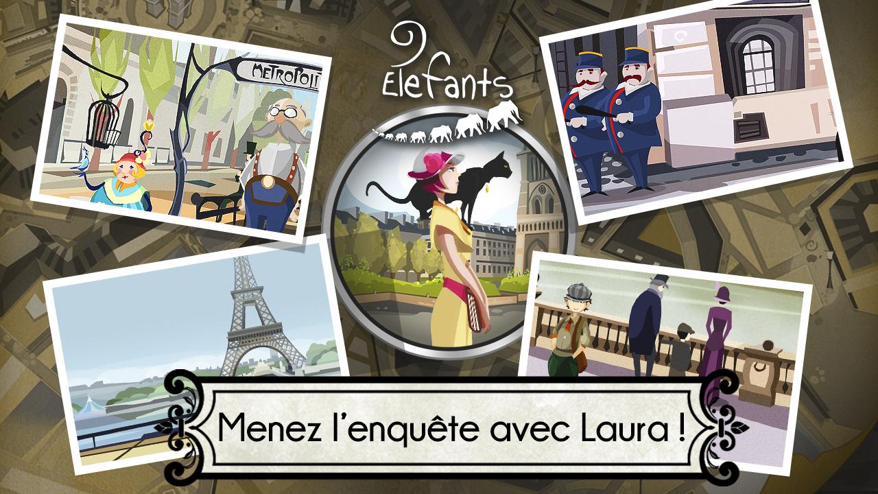 Akcja przygodówki 9 Elefants rozgrywa się w dwudziestowiecznym Paryżu. Fabuła opowiada nam o znanym profesorze, który przybywa do stolicy Francji, aby zaprezentować swój najnowszy wynalazek. Niestety, zostaje porwany, a jego córka rozpoczyna śledztwo i to my mamy jej pomóc w całym tym przedsięwzięciu.