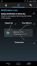 Na kolejnej zakładce mamy wykres zużycia baterii. Jest on rejestrowany na bieżąco. Poniżej srednie statystki na ile starcza bateria oraz ile zwykle zajmuje samo ładowanie. Kolejna zakładka, już przedostatnia to opcje obszaru powiadomień, gdzie możemy umieścić informacje o naszej baterii. Możemy tam przedstawić pozostały czas do rozładowania baterii, napięcie czy temperaturę. Oczywiście nie licząc ikonki.