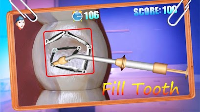 Kolejne etapy to kolejne rozdziawione szczęki z wszelakimi problemami. Gra mimo szybko uciekającego czasu niespecjalnie śpieszy się z wskazaniem ubytku, którym mamy się w tej chwili zająć, przez co mamy mniej czasu na wykonanie zadania. Musimy wtedy wskazać odpowiednie narzędzie, które poradzi sobie z wadą (błędne wskazanie to minusowe punkty) i gra przenosi nas do zbliżenia, w którym rozgrywa się mini gierka, w której operując przyrządami staramy się jak najdokładniej załatać niedoskonałości. Puszczając palec z ekranu sygnalizujemy grze, że skończyliśmy, a ta ocenia naszą dokładność punktami. I tak w kółko, póki nie skończymy wszystkich przewidzianych na poziom zadań, albo nie skończy się czas. Przy czwartym przypadku gra zaczęła mnie strasznie nudzić, szczególnie, że brakuje jej zróżnicowania- kleimy cały czas tą samą szczerbę, zmazujemy tą samą plamę z zęba.